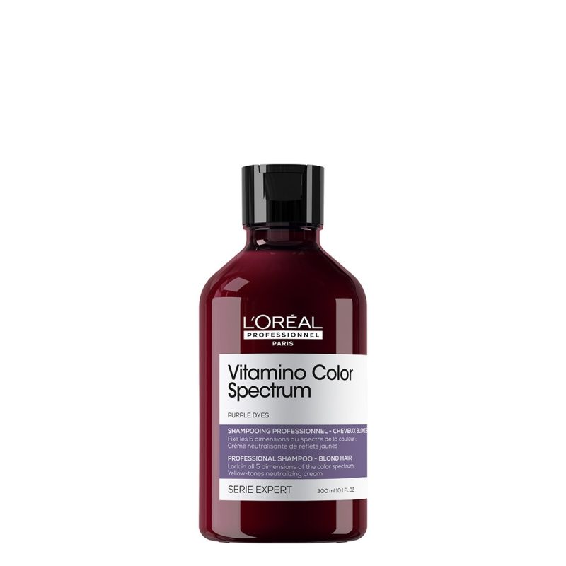Ett professionellt neutraliserande lila schampo för blont hår som neutraliserar oönskade gula toner. Från dag 1 efter färgning reflekterar håret alla 5 dimensionerna av färgspektrumet. Men dessa dimensioner förändras över tiden vilket leder till urtvättade och blekta färgresultat, ibland med oönskade nyanser. Detta vårdande schampo är formulerat med lila färgpigment och vårdande ingredienser. Håret blir omedelbart rent, näringsberikat, 91 % starkare*, 76 % mer återfuktat* och omedelbar 59 % mer glansigt*. Den krämiga lila formulan ger effekt på de 5 färgdimensionerna när den används tillsammans med det kompletta Vitamino Color Spectrum-systemet**.
